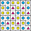 Rules: Zeichnen Sie in jedes Feld eines der drei Symbole (Kreis, Dreieck oder Quadrat) ein, wobei in jedem Gebiet entweder nur gleiche oder nur verschiedene Symbole stehen dürfen. Über eine Gebietsgrenze hinweg dürfen gleiche Symbole nicht benachbart sein.
