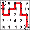 Tipp: Cross out all cells which cannot be part of the number chain.